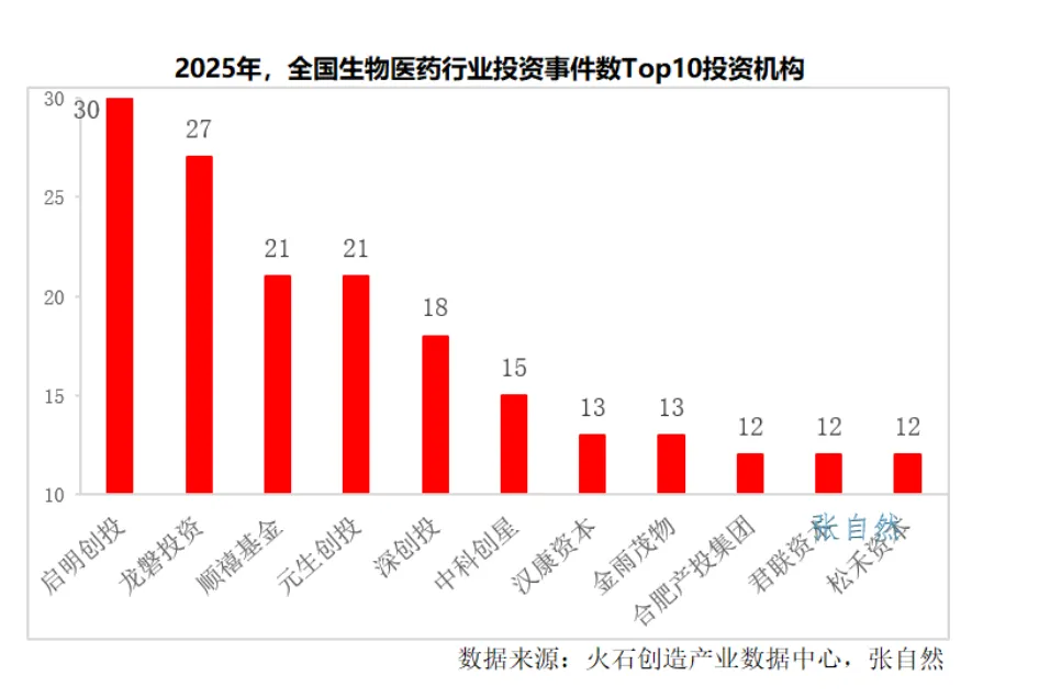 2025年,在我国生物医药产业投资事件数最多的是启明创投,共实施投资30起;
