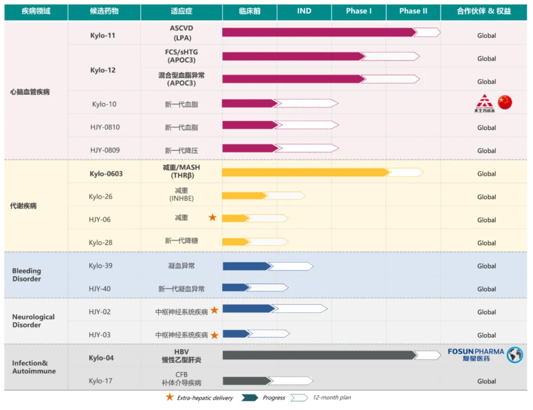 再来看看产品。从官网信息看,赫吉亚拥有超20款管线资产涵盖多个疾病领域,其中有4款产品进入临床阶段,最令市场关注、临床进度最靠前的莫过于靶向Lp(a)的siRNA管线Kylo-11。