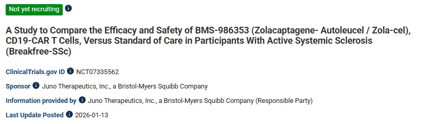 Zola-cel(Zolacaptagene Autoleucel,BMS-986353)是BMS基于NEX-T平台开发的一款CD19 CAR-T细胞疗法,于2020年进入临床阶段。截至目前,该药物已在系统性红斑狼疮、特发性炎症性肌病、系统性硬化症(SSc)和多发性硬化症人群中完成I期验证。