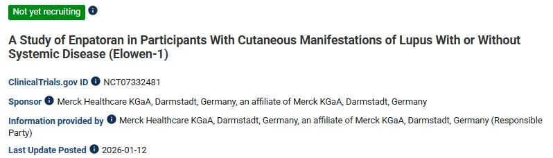Enpatoran是德国默克开发的一款口服Toll样受体7/8(TLR7/8)抑制剂,于2018年进入临床阶段。截至目前。该药物已在I期研究和II期研究中初步完成针对系统性红斑狼疮(SLE)适应症的验证。