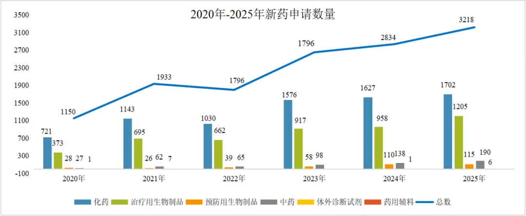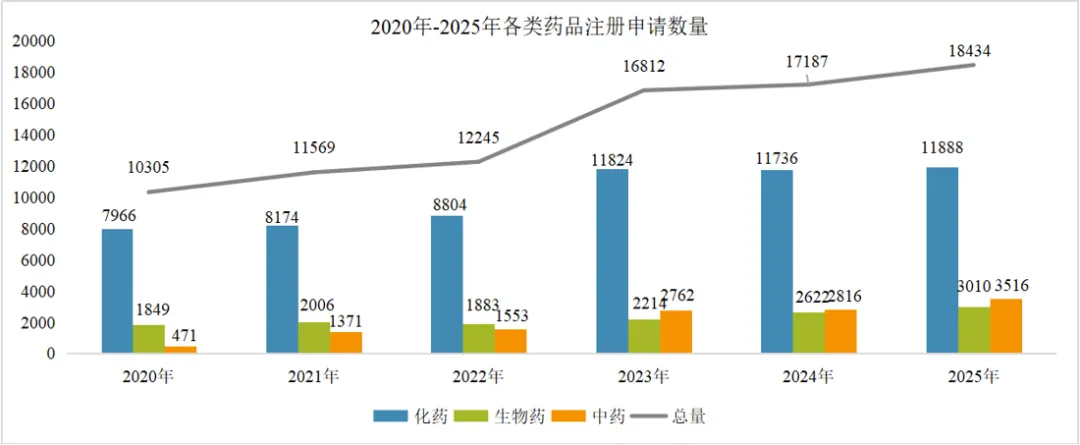 图1. 2020-2025年各类药品注册申请数量(单位:件)