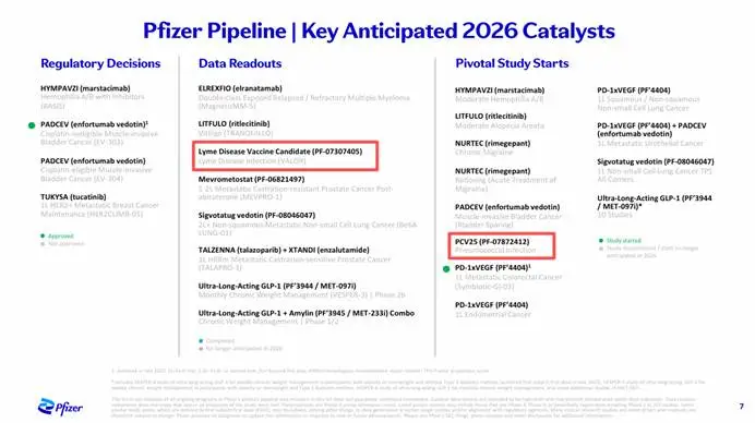 另一催化剂事件涉及肺炎疫苗。长期以来,辉瑞在肺炎疫苗领域始终占据主导地位。但随着2024年默沙东的21价肺炎球菌结合疫苗获批上市,其市场地位面临严峻挑战。为此,被寄予厚望的25价肺炎球菌结合疫苗PF-07872412不容有失,计划于2026年启动关键临床试验。
