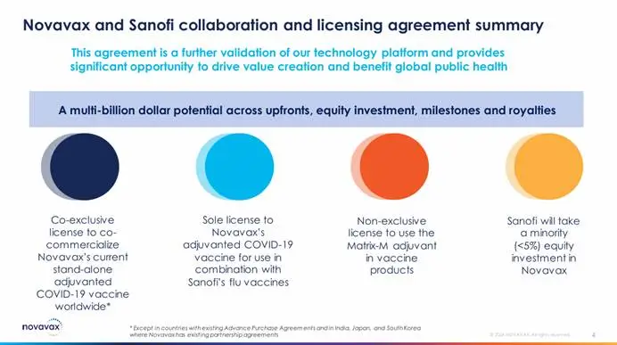 2024年5月,赛诺菲与Novavax达成总计15亿美元的一揽子协议。其中,花费12.7亿美元,拿到Nuvaxovid从2025年开始的全球商业化权益,不包括印度、日本和韩国,这是一款含佐剂的重组蛋白新冠疫苗;以及赛诺菲还获得联合开发新冠流感二联疫苗的独家授权;此外,还获得Novavax专有佐剂平台Matrix-M的非独家授权,外加Novavax的4.9%股份。
