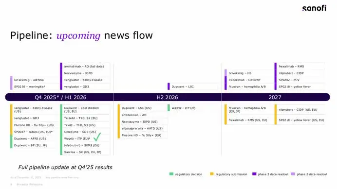 2025年12月,赛诺菲宣布以22亿美元收购上市疫苗公司Dynavax,从而获得一款已上市销售的成人乙肝疫苗HEPLISAV-B,一款在研带状疱疹疫苗候选苗(Z-1018)以及Dynavax 专有佐剂平台CpG 1018。