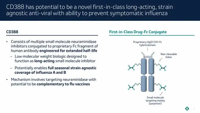 ,由多个小分子神经氨酸酶抑制剂(NAI)与专有的人源抗体Fc片段共价结合而成,通过工程化设计显著延长了药物的半衰期,可提供覆盖整个流感季的长效保护,对甲型和乙型流感病毒(包括高致病性及部分耐药毒株)均显示强效、广谱的活性,通过靶向神经氨酸酶发挥作用,有望与流感疫苗形成互补。此外,作为“被动免疫”制剂,可以直接提供抗体保护,因此对老年人、免疫功能低下者等疫苗应答不佳的人群尤其具有潜力。