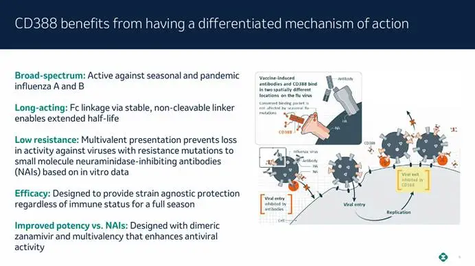 此外,默沙东在2025年11月还进行了一项重大并购:以92亿美元收购Cidara Therapeutics,从而获得CD388(MK-1406),一款用于预防流感的长效抗病毒药物,处于3期临床试验。计划在2026年一季度完成收购。虽然这并非传统疫苗,独特结构可实现长效、广谱流感预防功能,还是非常值得重点介绍。