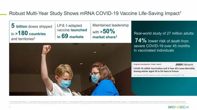 如今,BioNTech对于发家致富的mRNA疫苗业务似乎已经没那么关注了。在此次JPM26上,可以说只用了寥寥数语谈及,无非就是50亿剂次和超过50%市场份额。此外,还简要介绍了个性化新生抗原特异性免疫疗法iNeST和固定抗原疫苗BNT116的早期数据,显示诱导T细胞应答并带来生存获益。