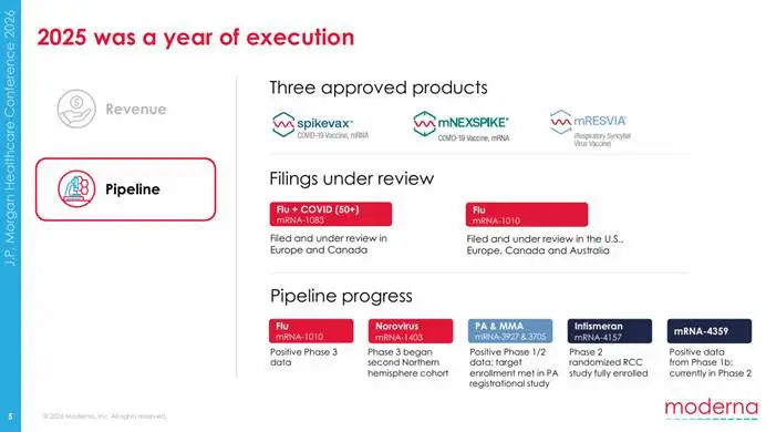 2025年,Moderna有两款新产品提交上市申请,分别是针对50岁以上人群的新冠流感二联疫苗mRNA-1083,以及流感疫苗mRNA-1010。这两款产品有望在2026年获批,并预计在2027/28流感季节进入市场。