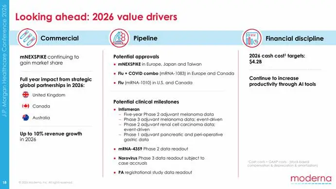 2024年该业务收入为110亿美元,2025年预计将降至65亿美元。到2026年,收入预计进一步回落至50亿美元,在全年595亿至625亿美元的总营收中占比将不足10%。需要指出的是,新冠业务不仅包含mRNA疫苗,也涵盖了口服药物Paxlovid。
