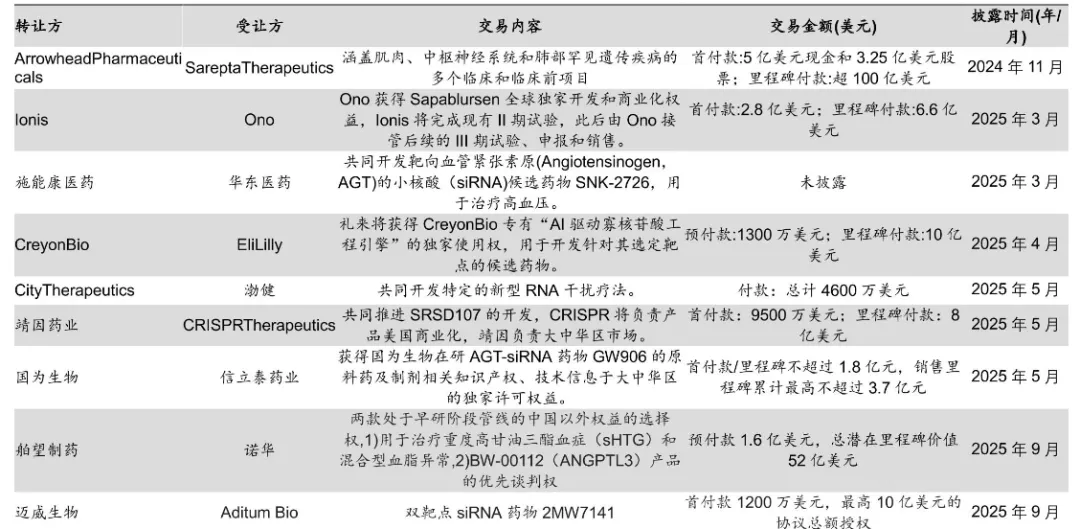 鉴于小核酸药物研发技术壁垒高、递送系统复杂的特性,MNC早期多以与三巨头合作为切入点,稳步积累行业经验;而随着全球市场规模持续扩容、赛道商业化潜力加速释放,MNC开始通过密集的BD交易疯狂加码,推动行业竞争格局加速重构。