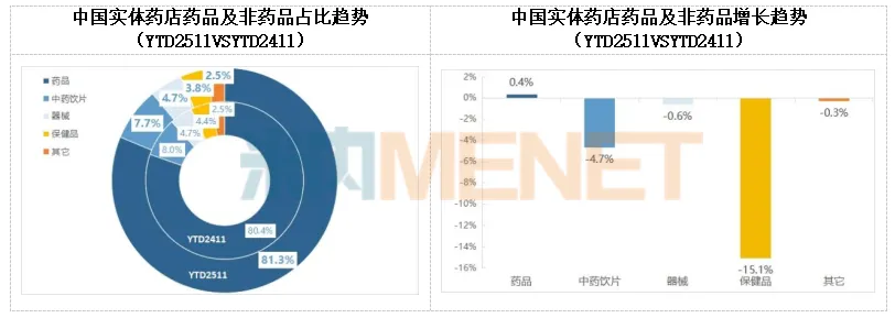中国实体药店药品及非药品占比趋势、增长趋势(YTD2511 VS YTD2411)