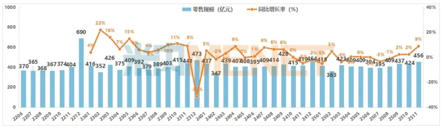 2025年11月,中国实体药店药品零售规模为456亿元,销售较上月上升7.5%,与去年同期相比,有8.8%的涨幅,涨幅为今年新高。从产品的层面看,主要是受感冒呼吸道用药的需求拉升引发。