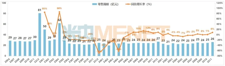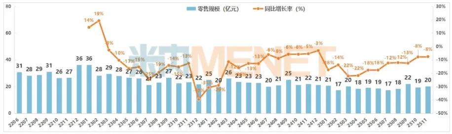 2025年11月中国实体药店医疗器械零售规模及变化趋势