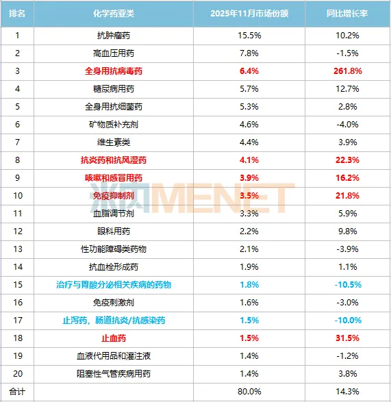2025年11月中国实体药店化学药TOP20品类份额及增长趋势
