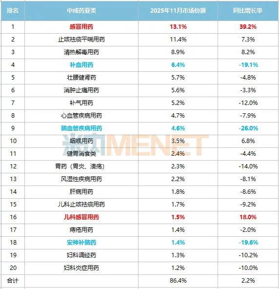 2025年11月中国实体药店中成药TOP20品类份额及增长趋势