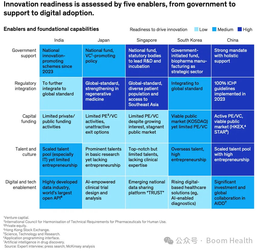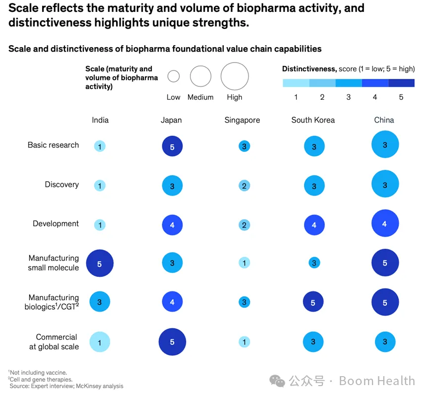 在制造环节,印度在小分子药物与仿制药制造方面保持全球领先地位,并逐步向生物制剂与复杂制剂扩展;中国与韩国在生物制剂、抗体类药物及先进治疗平台制造方面快速提升能力。商业化方面,日本与部分中国企业已具备全球运营经验,而新加坡则在区域市场部署与早期商业化支持上形成优势。