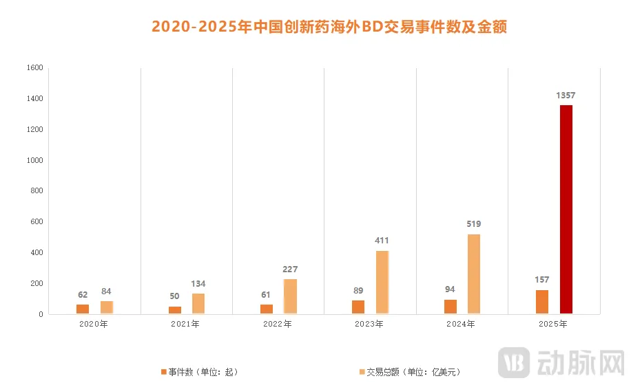 数据可以说明一切。据医药魔方NextPharma数据库显示,2025年中国创新药共完成157起BD出海授权交易,交易总额为1356.55亿美元,其中首付款70亿美元,这三项关键数据均创下历史新高。