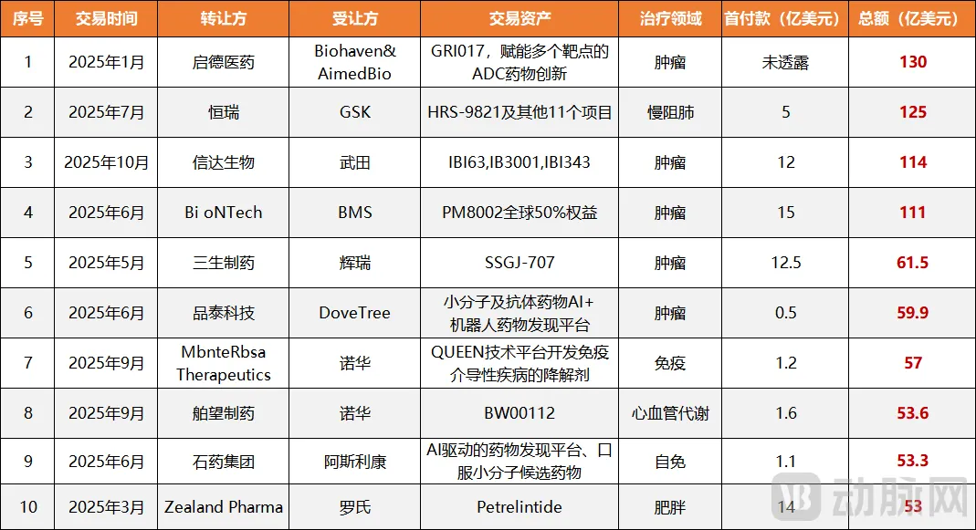 所以,一笔好的海外BD交易,绝对不是单一维度的最大化,而是需要在四个关键维度间取得符合双方当前利益以及长期战略的最佳平衡。按照这一评价体系,动脉网也评选出了“2025年国内十大创新药海外BD交易”,榜单如下,排名不分先后: