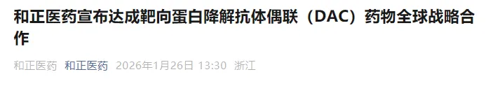 1月26日,和正医药宣布与一家美国Biotech公司建立靶向蛋白降解抗体偶联(DAC)药物的全球合作伙伴关系。这是中国生物医药企业在DAC这一前沿领域的首笔海外合作交易。