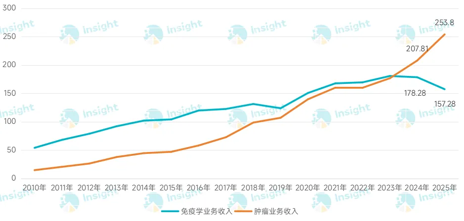 十五年前,强生肿瘤的业绩只有区区 14.65 亿美元,在创新药收入中的占比仅有 6.5%。如今,它已成功超越自免跃升为强生创新药收入的第一大支柱。最新发布的 2025 年财报显示,强生肿瘤业务继续保持 22.1% 的高速增长,创收 253.8 亿美元,是自免的 1.56 倍,贡献了创新药板块 42% 的收入。