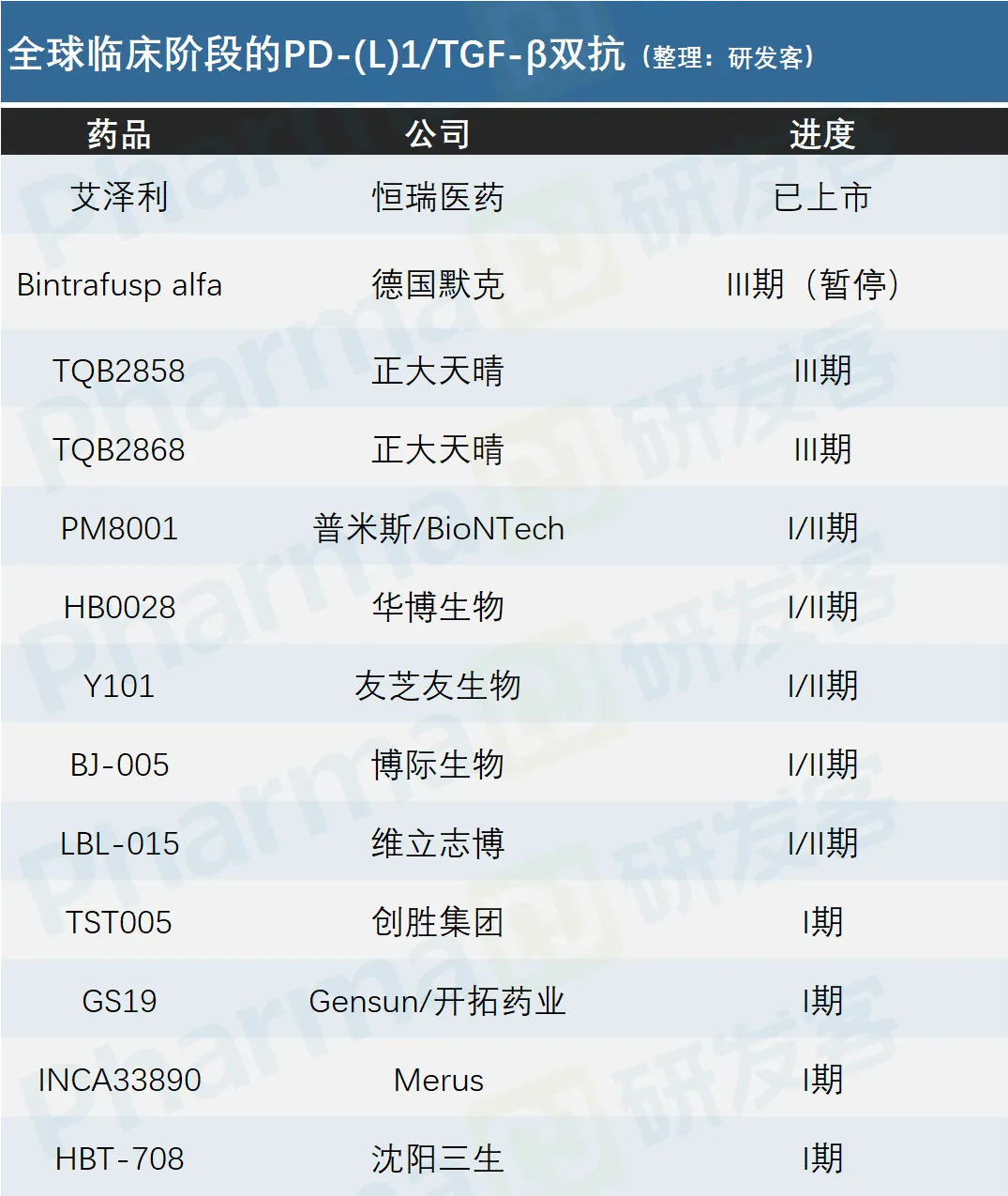 由于肺癌、胆管癌III期研究失败,德国默克与GSK终止了bintrafusp alfa(M7824)的开发。目前该领域紧随艾泽利的是正大天晴的TQB2858和TQB28689(III期),其他产品均处于临床I/II期。(见上图)