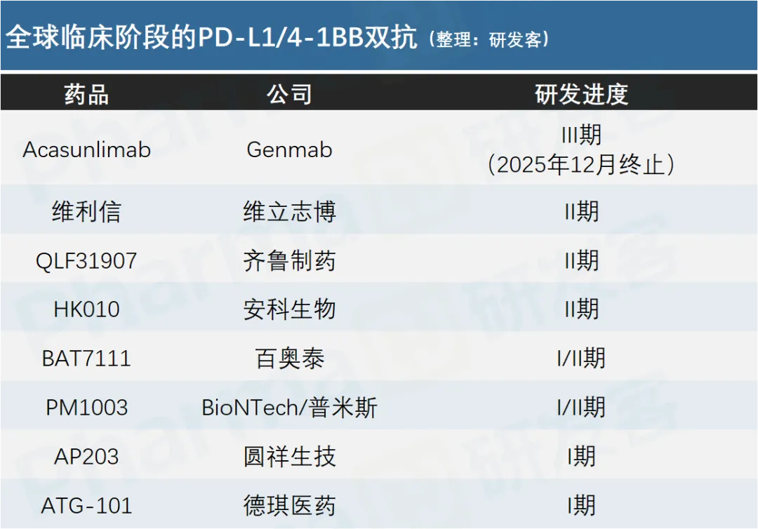 针对PD-(L)1单药响应率有限及原发或继发耐药,PD-(L)1/4-1BB双抗也在发力。Genmab在2025年底出于管线开发优先级调整的原因,终止了acasunlimab的III期研究。目前,维立志博的维利信进度领先,齐鲁制药的QLF31907和安科生物的HK010紧随其后。(见下图)