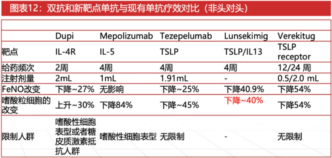 从机制与疗效来看,TSLP/IL-13和TSLP/IL-4R这两种组合具备良好的互补性。在疗效优势和更广谱的患者人群覆盖上,临床试验中已初步展现出超越现有单靶点疗法的潜力。如在受益人群方面,TSLP单抗Verekitug获批用于哮喘没有人群限制,双抗未来有望也实现广谱覆盖。