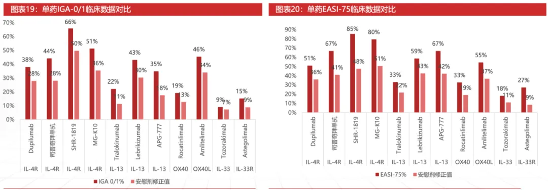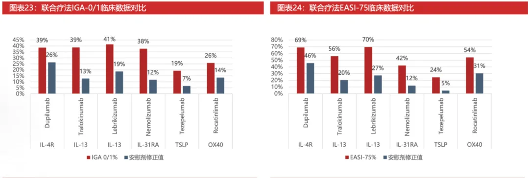 针对特应性皮炎,从单药有效性来看,IL-4R目前仍是最优选,IL-13次之。目前,临床进度最快的4款自免双抗(三抗)涉及靶点为IL-4R、IL-13、IL-33和TSLP。