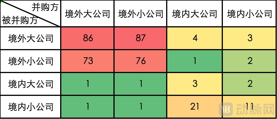 相比之下,跨境并购交易的活跃度最低。其中,境内公司作为买方,收购境外公司的交易数量极少,其中境内大公司收购境外大公司交易4起、收购境外小公司交易1起;境内小公司收购境外大公司交易3起、收购境外小公司交易2起。反之亦然,境外大公司收购境内大公司与境内小公司各1起,境外小公司收购境内大公司与境内小公司也各1起。