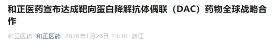 1月26日,和正医药宣布与一家美国Biotech公司建立靶向蛋白降解抗体偶联(DAC)药物的全球合作伙伴关系。