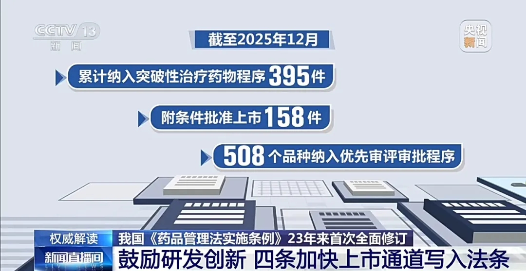 据介绍,我国2020年发布实施《药品注册管理办法》,首次设立这四个加快上市通道,截至2025年12月,累计纳入突破性治疗药物程序395件,附条件批准上市158件,508个品种纳入优先审评审批程序,一大批临床急需药品加快上市,满足患者临床需求。国家药监局统计显示,我国创新药平均审评时限较2018年缩短了25%。