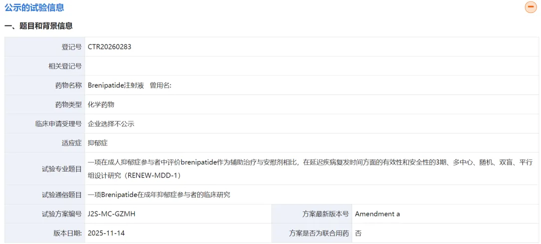 2026年1月26日,礼来在药物临床试验登记与信息公示平台网站上注册了Brenipatide治疗成人抑郁症的全球三期临床RENEW-MDD-1,采用多中心、随机、双盲、平行组设计,核心研究目标聚焦于评估 Brenipatide 作为辅助治疗药物在延迟成人重度抑郁症(MDD)患者复发时间方面的疗效与安全性,并通过与安慰剂对比明确其临床价值。