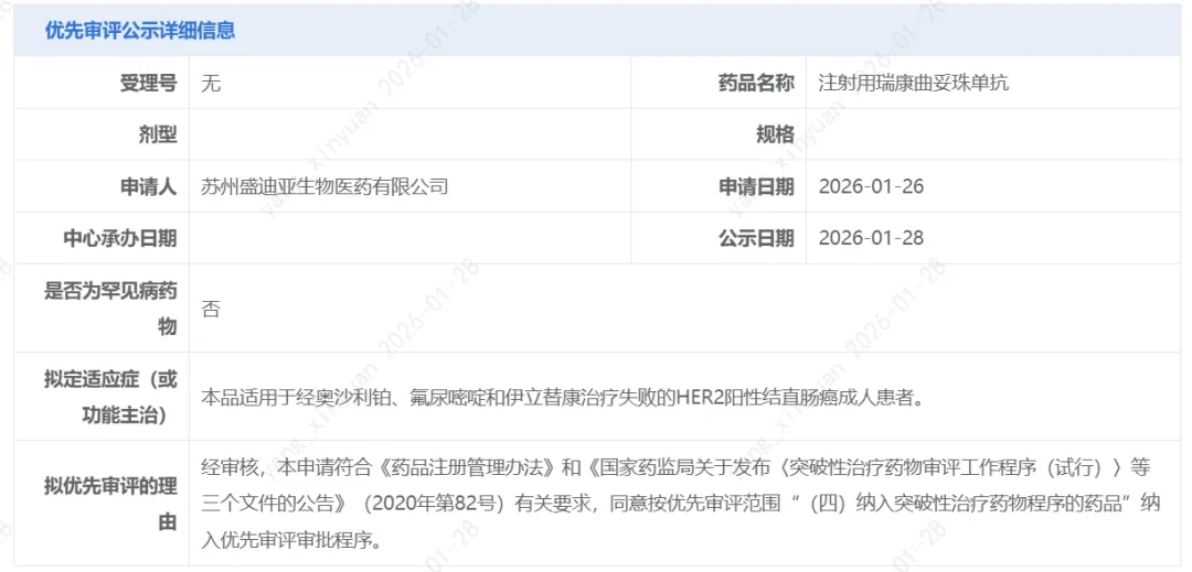 1月28日,中国国家药监局药品审评中心(CDE)官网最新公示,恒瑞医药申报的注射用瑞康曲妥珠单抗拟纳入优先审评,适用于经奥沙利铂、氟尿嘧啶和伊立替康治疗失败的HER2阳性结直肠癌成人患者。公开资料显示,瑞康曲妥珠单抗(SHR-A1811) 是一款以HER2为靶点的抗体偶联药物(ADC)。针对结直肠癌适应症,该产品此前已经被CDE纳入突破性治疗品种。