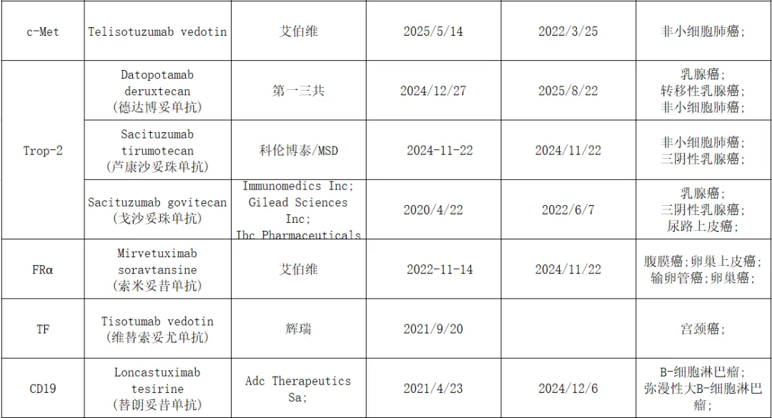 芦康沙妥珠单抗(佳泰莱®):由科伦博泰研发的国产TROP2 ADC,凭借其高药物抗体比(DAR)等优化设计成功获批,体现了国内企业在热门靶点上的快速跟进与差异化创新能力。