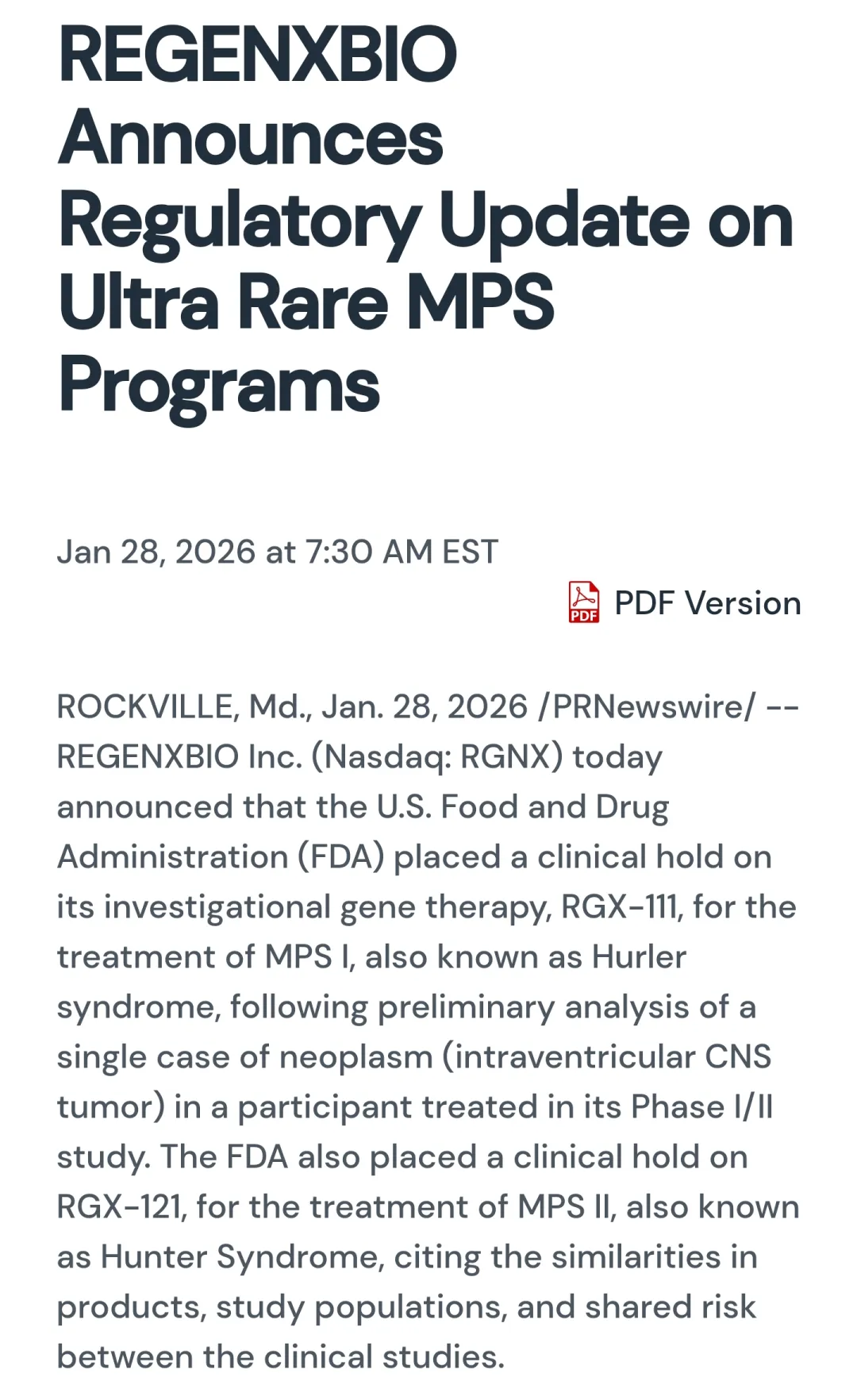 2026年1月28日电】 美国食品药品监督管理局(FDA)于1月28日宣布对生物技术公司Regenxbio(纳斯达克代码:RGNX)的两项基因疗法临床试验实施临床暂停(clinical hold),原因是一名参与试验的5岁儿童在接受治疗后出现脑瘤。