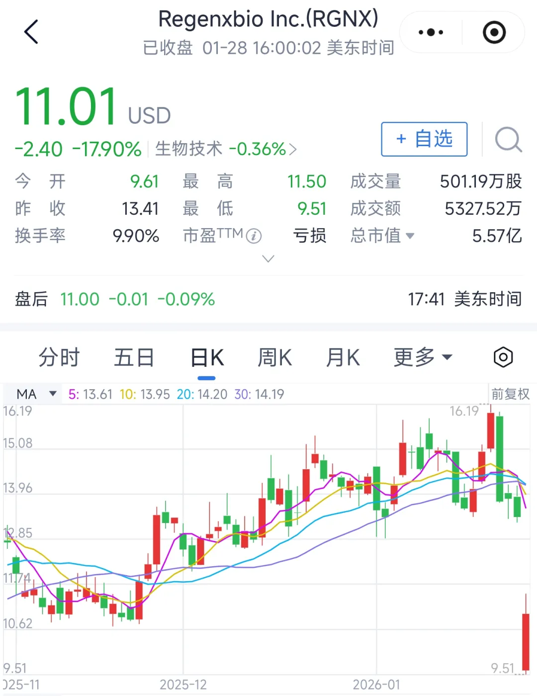 受此消息影响,Regenxbio股价周三暴跌近17.9%,盘前交易中跌幅一度达30%。