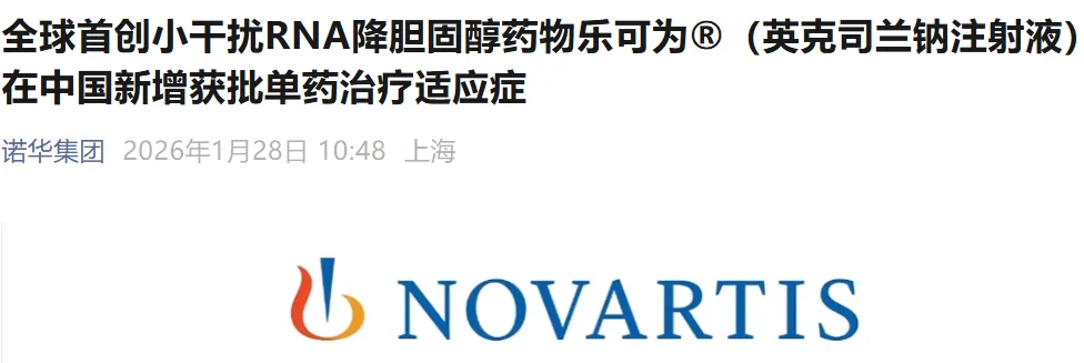 2026年1月28日,诺华宣布,其创新降胆固醇药物乐可为®(英克司兰钠注射液)新适应症获得中国国家药品监督管理局(NMPA)批准。此次获批,允许该药作为饮食的辅助疗法,单药用于治疗成人原发性高胆固醇血症(非家族性)或混合型血脂异常患者,以降低其低密度脂蛋白胆固醇水平。