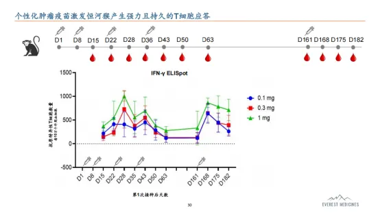 具体而言,在恒河猴体内试验中,EVM16 呈现出三大显著特点:起效快、免疫应答强、效果持久。更关键的是,在第 161 天接种加强针后,疫苗仍能激发恒河猴体内产生强力且持久的 T 细胞应答。这意味着,EVM16 与 Moderna 肿瘤疫苗呈现出高度一致的效果,均显示出能够显著延缓肿瘤复发的潜力。
