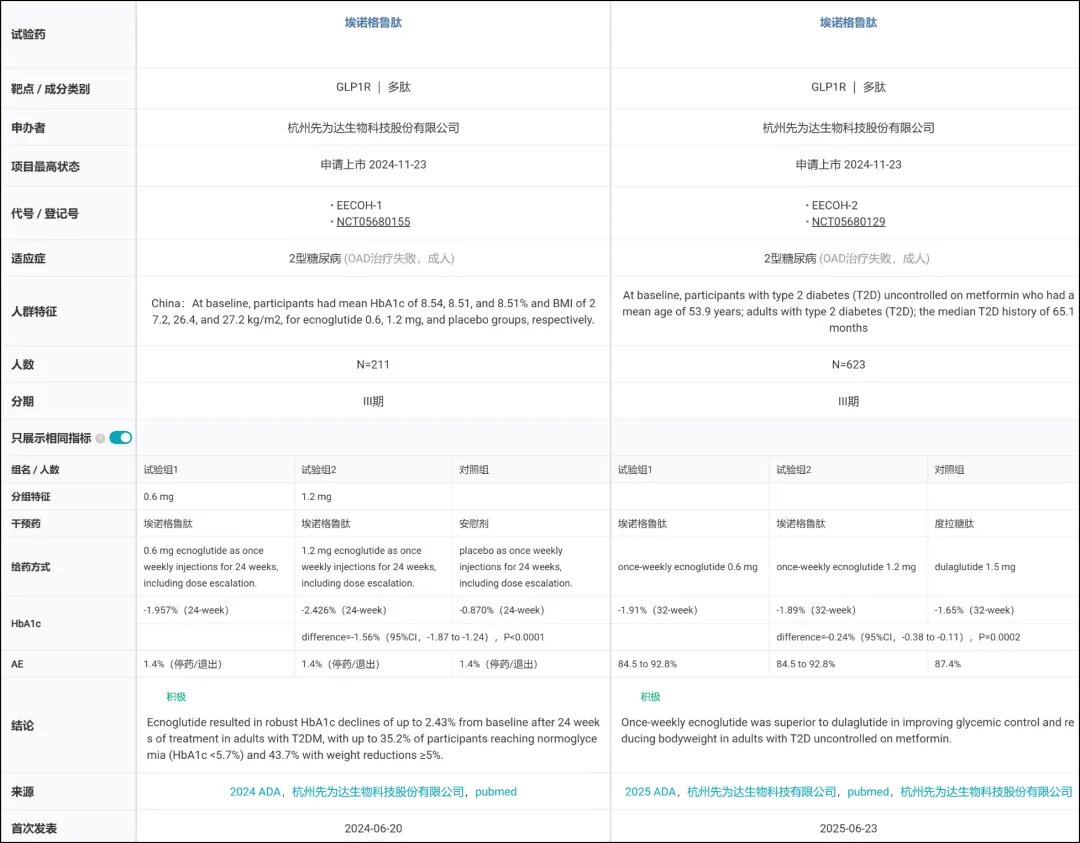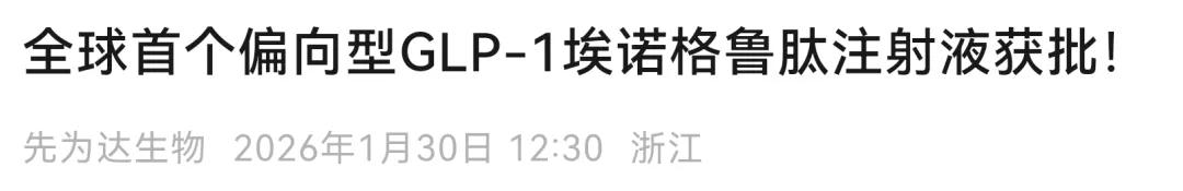 1 月 30 日,先为达生物 GLP-1 受体激动剂「埃诺格鲁肽」在国内获批上市,适用于成人 2 型糖尿病患者血糖控制,成为全球首个获批上市的 cAMP 偏向型 GLP-1 受体激动剂。