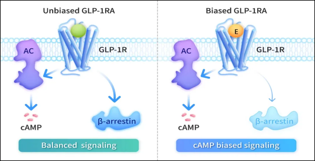 GLP-1 受体激动剂不同,埃诺格鲁肽选择性激活 cAMP 信号通路,同时最小化 β-arrestin