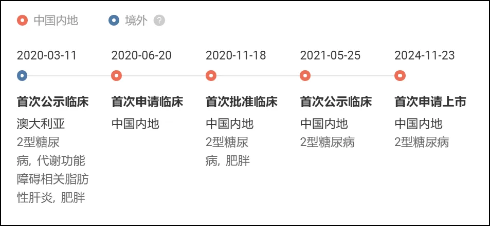 Insight 数据库显示,埃诺格鲁肽最早在 2020 年 3 月首次公示临床,2024 年 11 月在国内申报上市,用于 2 型糖尿病;同年 12 月,又在国内申报了减重适应症。