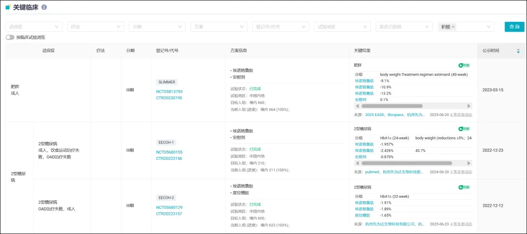 埃诺格鲁肽注射剂目前已有 5 项 III 期临床试验公示,其中 3 项已经公布临床结果,包括针对 2 型糖尿病的 EECOH-1 和 EECOH-2 研究,以及针对肥胖适应症的 SLIMMER 研究。