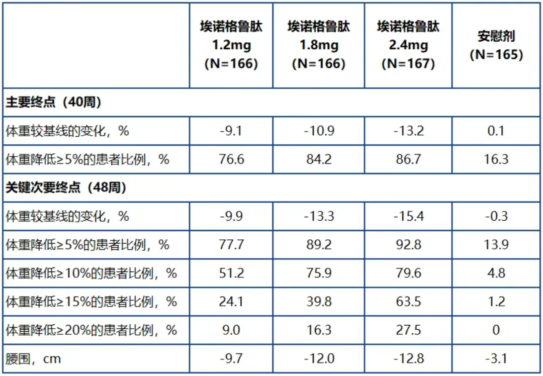 最高剂量(2.4 mg)组平均体重较基线降低 13.2%,而安慰剂组增加 0.1%(p<0.0001)。至第 48 周时,体重降幅进一步提升至 15.4%(安慰剂校正后为 15.1%);