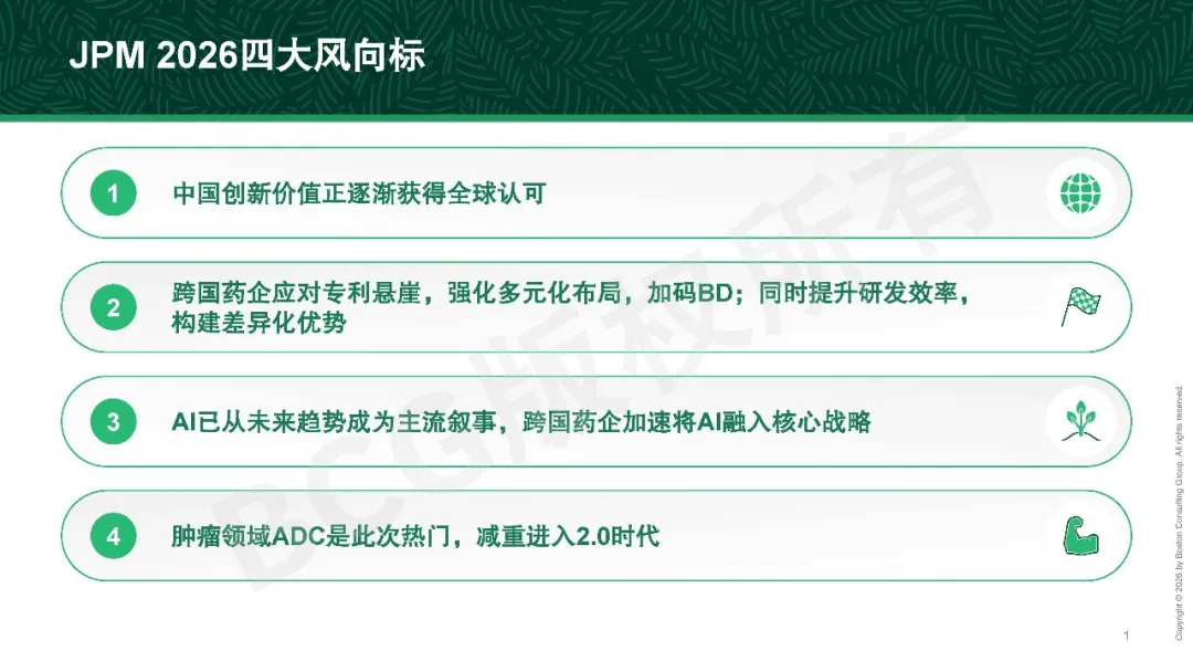 过去一年,全球医药产业的讨论重心正在发生转移。技术突破和创新依然重要,但当前被更频繁、更反复提及的问题是:这些创新能否在不确定性上升的环境中得到有效配置、持续放大,并最终转化为可兑现的长期价值。在这一背景下,2026年摩根大通医疗健康大会(以下简称JPM 2026)并未试图塑造新的颠覆性叙事,而是将焦点集中在放大这一转向本身。大会所呈现的,是全球药企在管线压力、效率约束与资源再配置背景下的集体校准。在这一过程中,中国创新资产在整体讨论中的定位也发生了实质性变化。中国创新不再被单独置于区域语境中加以审视,而是更频繁地被纳入全球产品组合与资产配置框架中,进行综合比较与取舍。