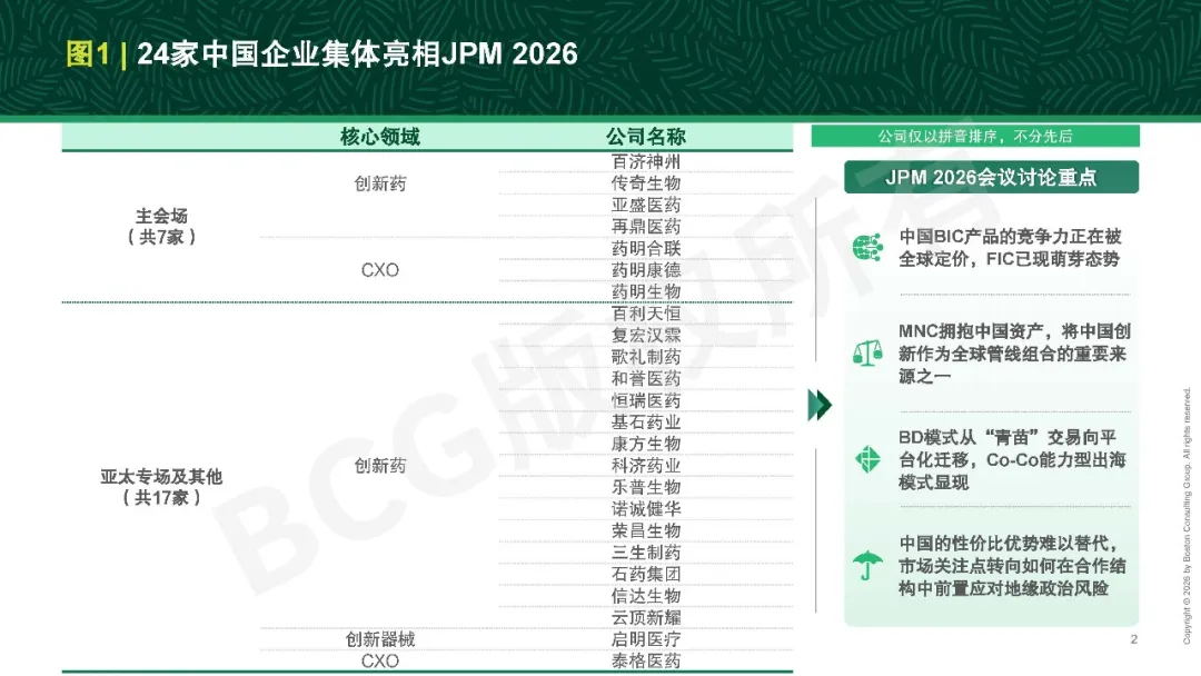 在JPM 2026的舞台上,中国企业参与度持续提升。7家中国企业受邀入选主会场,此外另有17家参与亚太专场或举办一对一路演(参阅图1)。无论从数量、层级还是参与形式来看,中国企业在本届大会中的存在感均较往年显著提升,反映出国际资本与跨国药企对中国资产的认可持续上行。