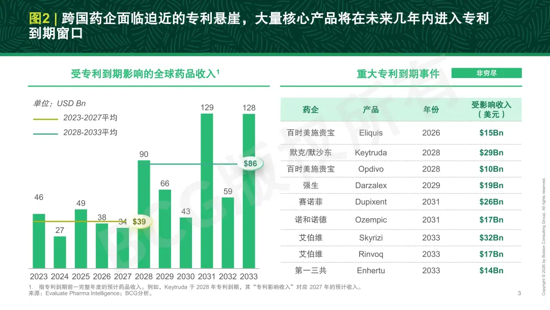 多家跨国药企正迈入一个密集的专利悬崖期。未来数年内,多款重磅产品将陆续面临专利到期,涵盖肿瘤、自身免疫、代谢、心血管等多个关键治疗领域,对收入结构与中长期增长构成实质性压力,使得管线补位的紧迫性显著上升(参阅图2)。