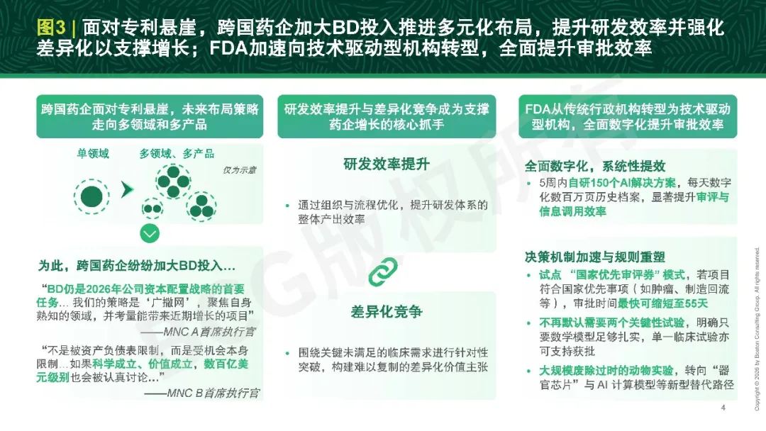 跨国药企应对专利悬崖,强化多元化布局,加码BD;同时提升研发效率,构建差异化优势