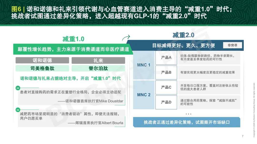 在非肿瘤领域的减重赛道,在诺和诺德与礼来GLP-1产品的推动下,代谢与心血管领域已进入由消费需求主导的新阶段,呈现出明显的消费属性(参阅图6)。增长动能主要来自消费渠道而非传统医疗渠道,购买行为更多由患者主动选择驱动,而不再完全依赖医疗与支付体系。随着患者对直接购药需求的增强,减重药物正逐步从以医疗支付为中心的处方产品,演变为以消费者决策为核心的健康管理工具。