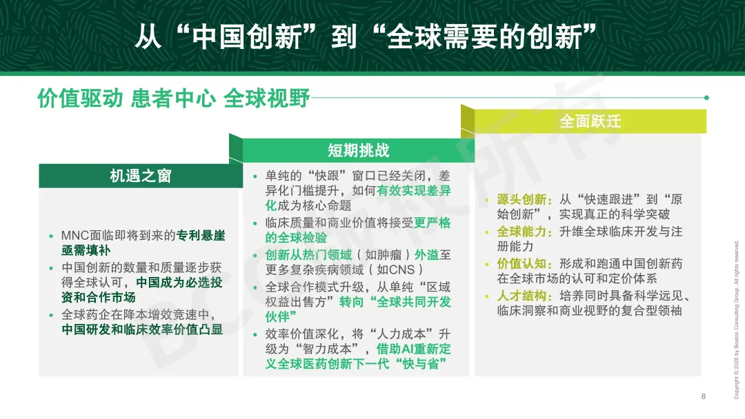 展望未来,中国医药创新正处于一次全面跃迁的关键阶段。在源头端,需产出经得起全球验证的真正科学突破;在能力端,要升维全球临床开发与注册能力;在价值端,跑通中国创新药在全球市场被理解、被认可、被定价的完整路径;在人才端,持续培养兼具科学远见、临床洞察与商业视野的复合型领导者。随着这一跃迁不断推进,我们相信,中国医药创新将不仅被需要,更会在全球舞台上释放更大的影响力,扮演更加关键的角色。