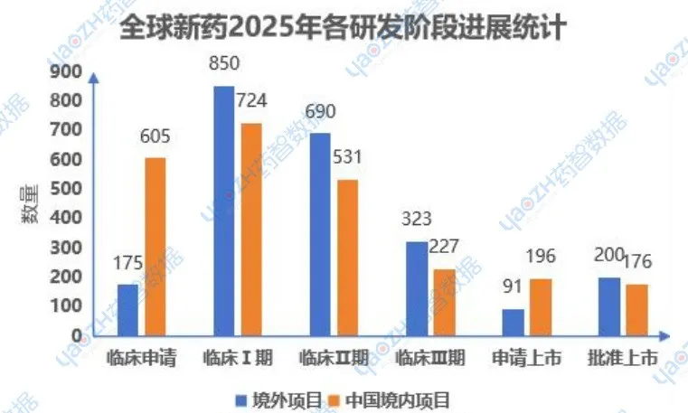 2025年,包括创新药、改良型新药、生物类似物在内的,研发阶段从临床申请到批准上市阶段,全球范围内共有4788个新药项目推进到最新的阶段(首次获批进入下个新阶段),其中在中国境内进行的项目共2459个,境外项目有2329个。其中创新药占84%,改良型新药占13%,生物类似物占3%。具体研发阶段药品内容可通过药智数据【全球药物分析系统】进行查看。